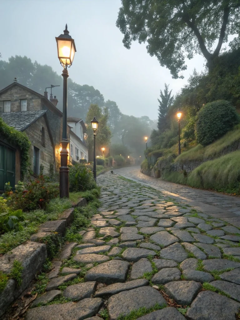 Pair cobblestone roads with matching street lamps, wooden benches, or flower pots to complete a village street ambiance.