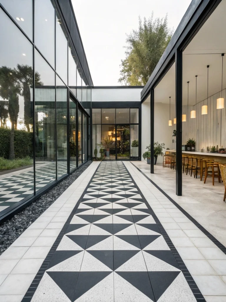 Modern tile paths offer a sleek, sophisticated look with clean lines and geometric patterns. Use crisp black, white, and gray tiles arranged in repeated shapes like squares, diamonds, or hexagons.