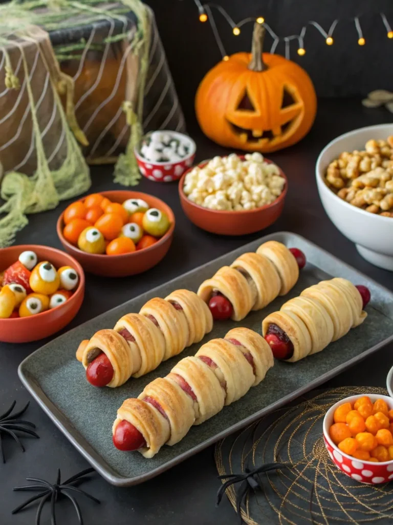 Examples include mummy hot dogs wrapped in crescent rolls, “monster eyeball” grapes, and orange-black popcorn mixes. Present snacks in colorful, festive containers to enhance the party vibe.