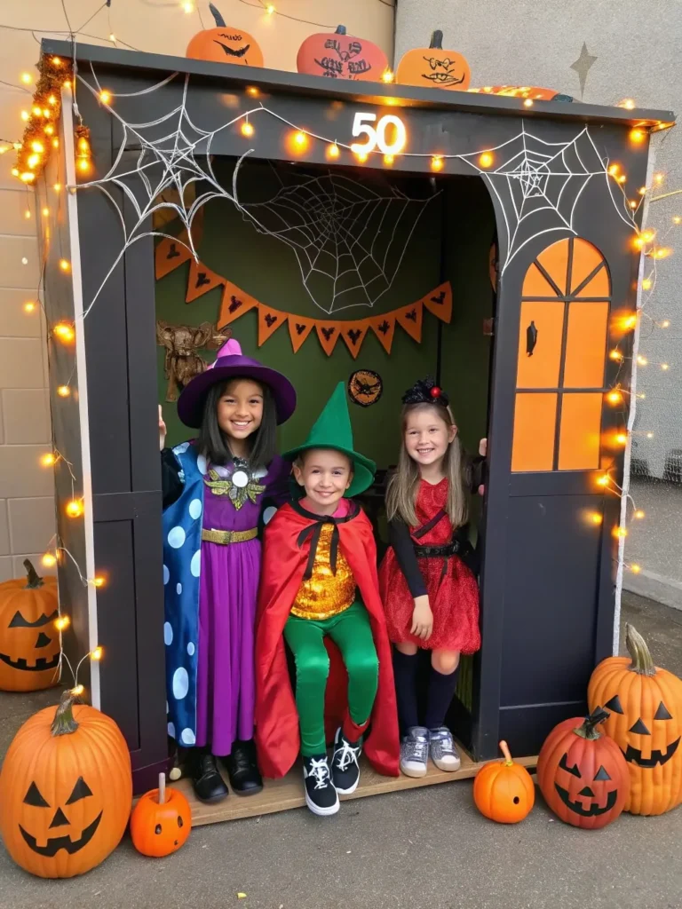 Create a Halloween-themed photo booth with props and a festive backdrop where kids can take silly and memorable pictures. Props such as witch hats, fake mustaches, and colorful masks add to the fun. A dedicated photo area also helps parents capture lasting memories.