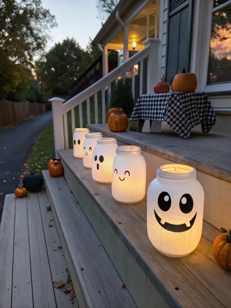 Create glowing ghost lanterns using simple mason jars and battery-operated tea lights. Paint the jars white, add spooky eyes and mouths with black paint or markers, and place a light inside. These lanterns make charming, safe Halloween decorations.