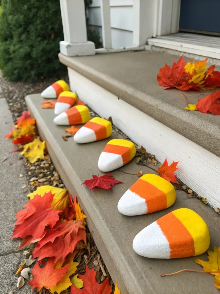Turn smooth rocks into colorful candy corn decorations with acrylic paint. Paint bands of white, orange, and yellow on each rock, and seal with varnish. These can be used as festive paperweights or garden décor.