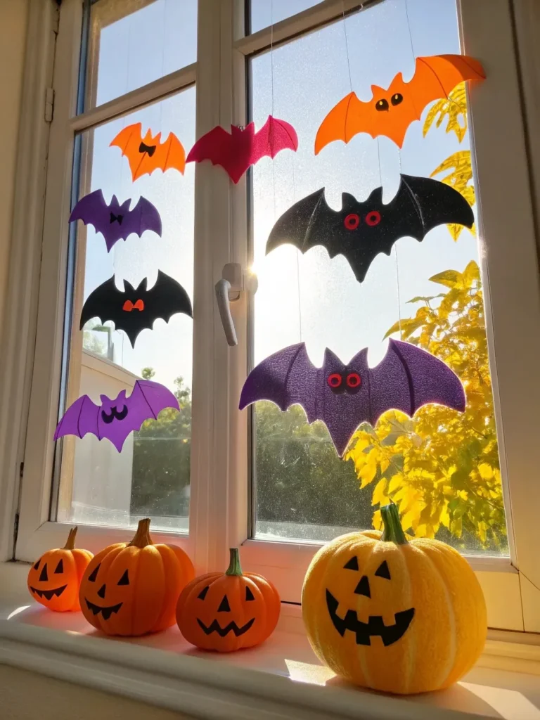 Make reusable window clings using colored craft foam or puffy paint on clear plastic sheets. Cut out shapes like ghosts, bats, and pumpkins, then stick them to windows. These clings brighten windows and are easy to remove after Halloween.