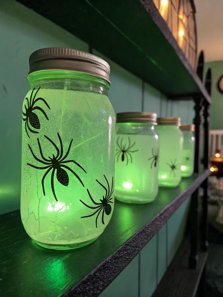 Create spooky glow jars using clear jars filled with glow-in-the-dark paint or powder mixed with water. Add plastic spiders or eyeballs inside for effect. These jars glow eerily in the dark and make unique decorations.