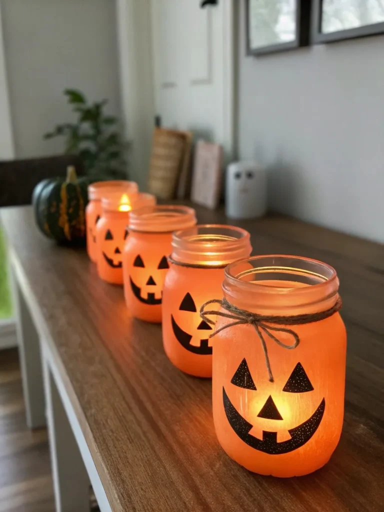 Transform mason jars into pumpkin holders by painting them orange and adding black or green detailing for faces and stems. Fill with candy or use as candle holders. These jars are versatile and festive additions to Halloween décor.
