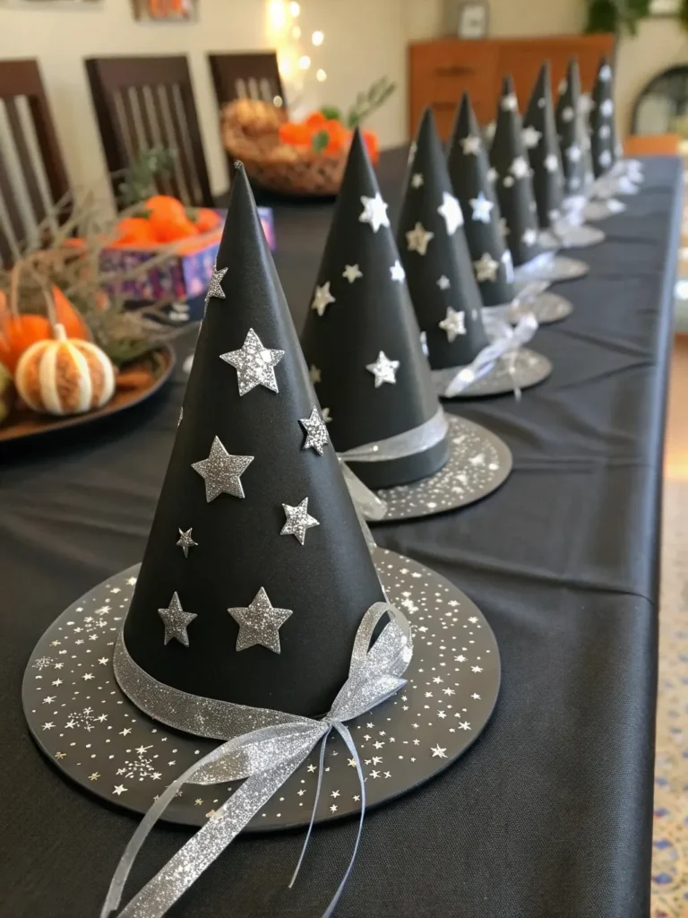 Craft mini witch hats from black construction paper or felt to use as party favors or table décor. Decorate hats with ribbons, stars, or glitter. Add elastic bands if you want kids to wear them.