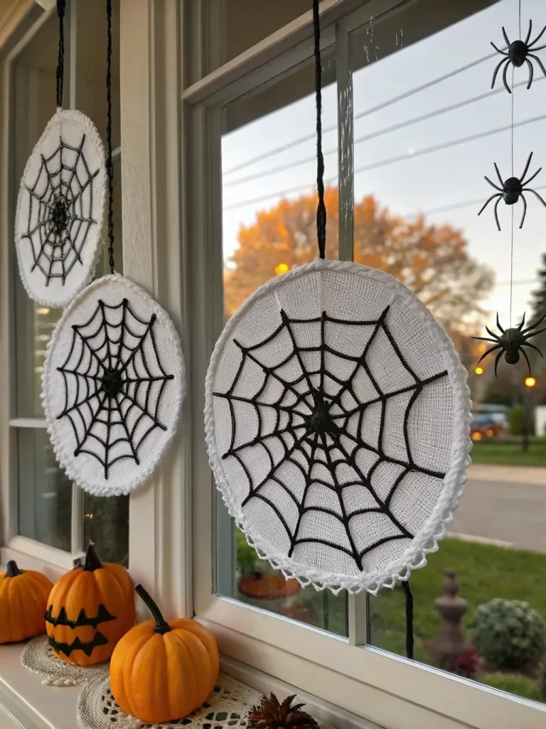 Use white paper doilies and black yarn to create spiderweb decorations. Stretch yarn across the doily in a web pattern and add a plastic spider in the center. Hang these delicate webs in windows or from ceilings.