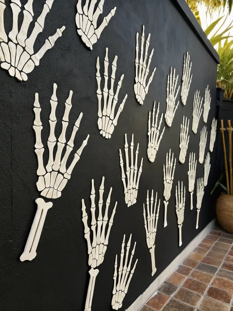 Craft spooky skeleton hands using white paper plates cut into finger shapes and connected with brads or tape. Arrange on a black background to create wall art or mobiles. Paint details and add glitter for extra effect.