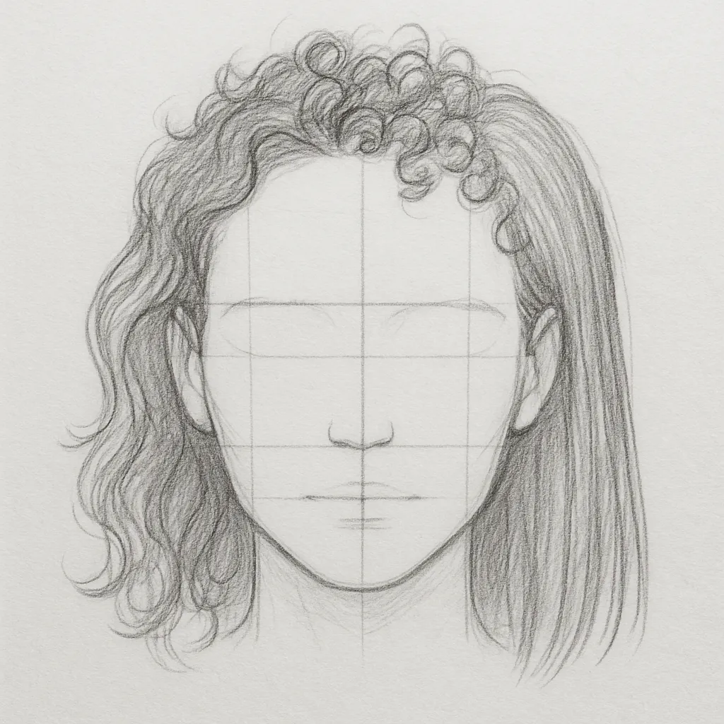 Sketch the hairline roughly above the forehead. Then, add hairstyle of your choice—curly, wavy, or straight.