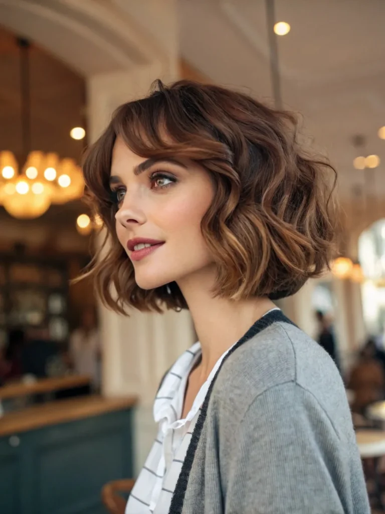 Soft waves add romantic volume to short bob haircuts. Use a curling wand and finger-comb for a natural finish. This style is versatile for casual or formal occasions. It works well for adding body and softness to straight hair.