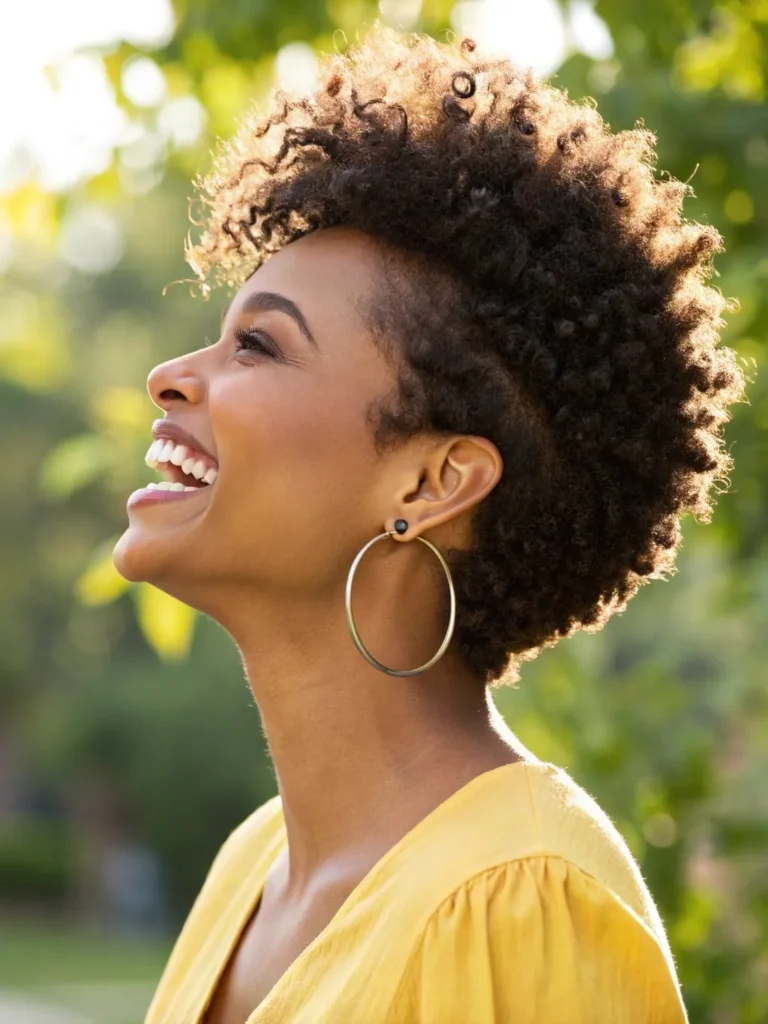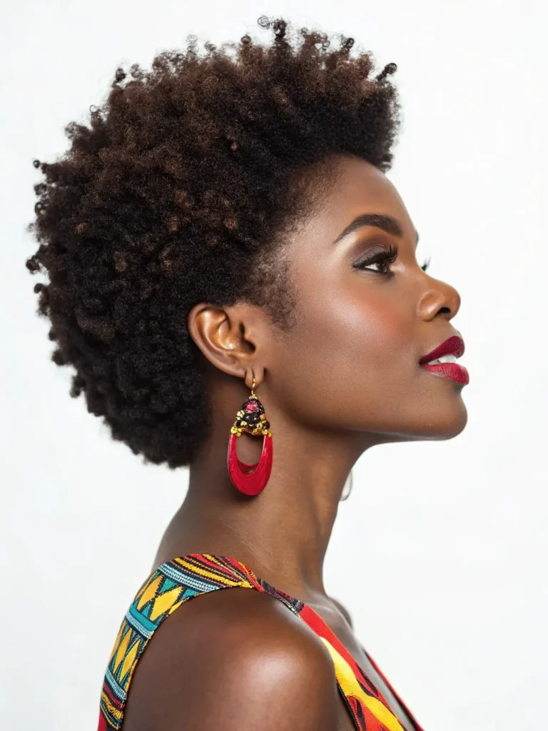 The short afro embraces natural curls in a rounded shape. It highlights texture and volume beautifully. Regular moisturizing and trims keep it fresh and vibrant. This style is bold, stylish, and celebrates natural hair.
