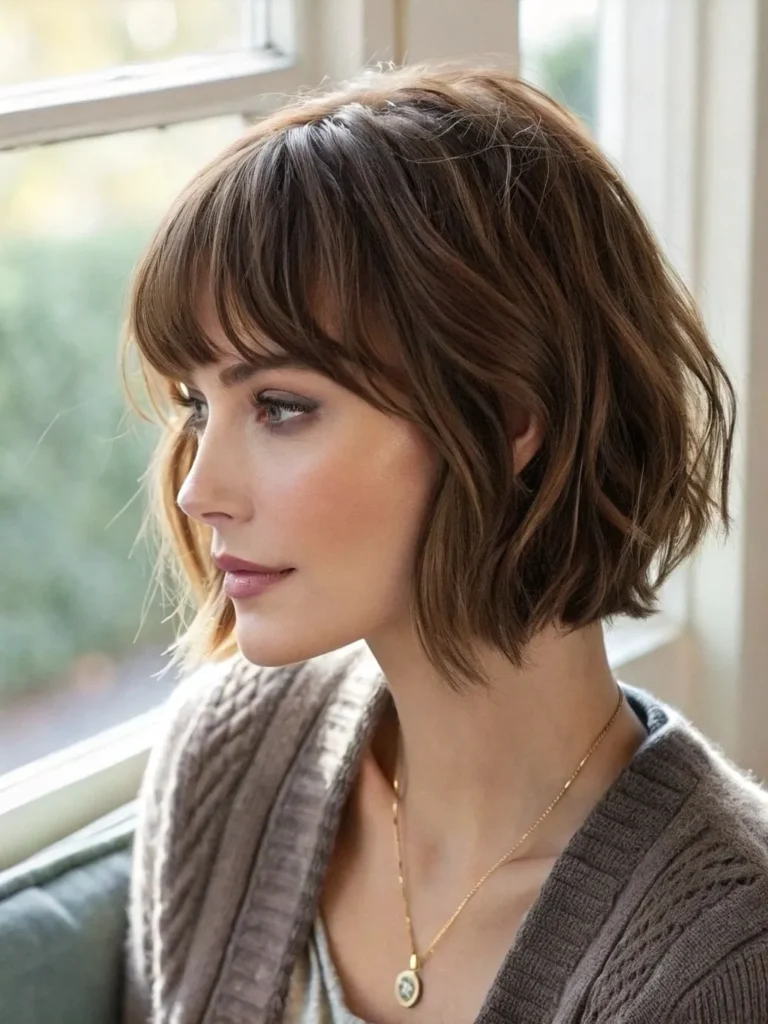 A layered crop paired with bangs adds softness and volume to short hair. Bangs can be blunt, side-swept, or wispy, framing the face beautifully. This style suits a variety of hair textures and face shapes. It offers versatile styling options from sleek to tousled looks. The bangs create a youthful, playful vibe.